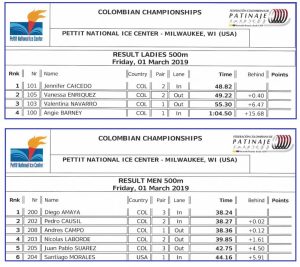 El juvenil Diego Amaya se destacó en el primer día de competencias del 4º Campeonato Nacional de patinaje sobre el hielo que se cumple en el óvalo del Pettit National Ice Center de la ciudad de Milwaukee, Estados Unidos. Amaya ganó la medalla de oro de los 500 metros y de paso impuso un nuevo registro nacional juvenil de la distancia al parar los cronómetros en 38:24. En esta prueba la medalla de plata fue para Pedro Causil y el bronce quedó en poder de Andrés Felipe Campo.