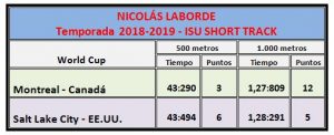 Nicolás Laborde será el único deportista latinoamericano que participará en estas copas mundo de pista corta del patinaje sobre hielo de la temporada 2018-2019, competencias que ya cumplieron su cita en Montreal, Canadá, y Salt Lake City, Estados Unidos, en el pasado mes de noviembre.